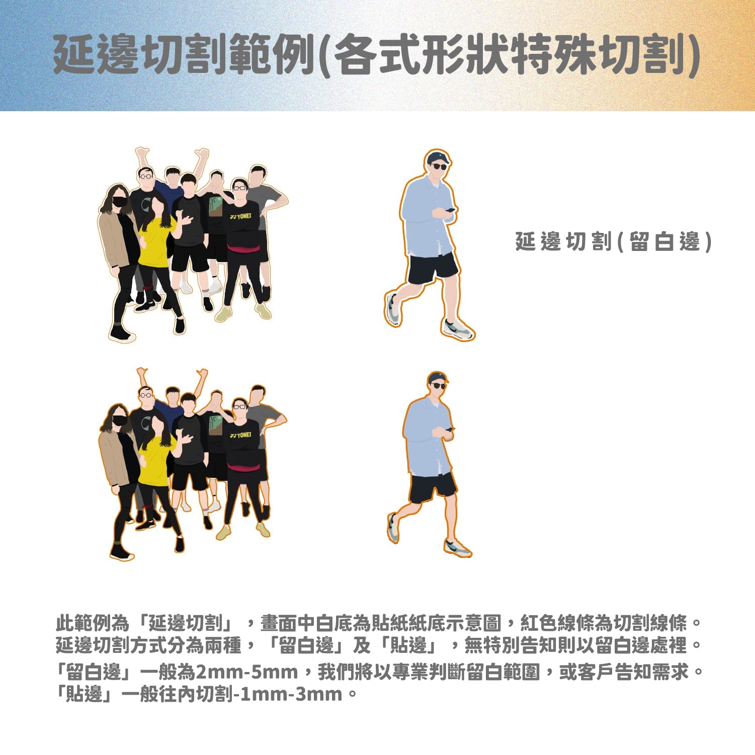 - 貼紙檔案若為有外框設計的客戶請斟酌,切割一定會有誤差所造成圓形外框或是矩形外框不等邊之問題