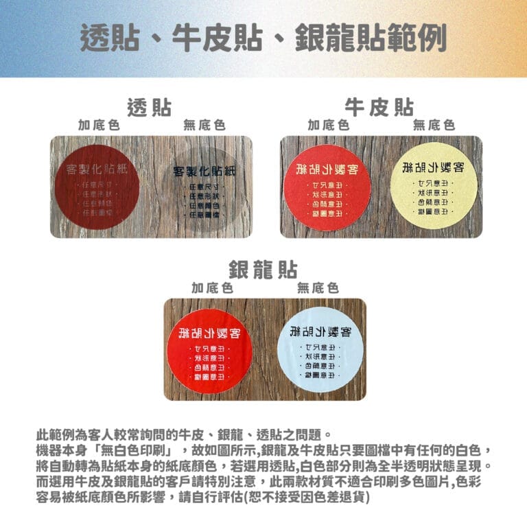 - 無法印刷金、銀、白三色,白色(除珠光.銅板.PVC本身為白底),其他材質遇到白色皆以貼紙底色為主,