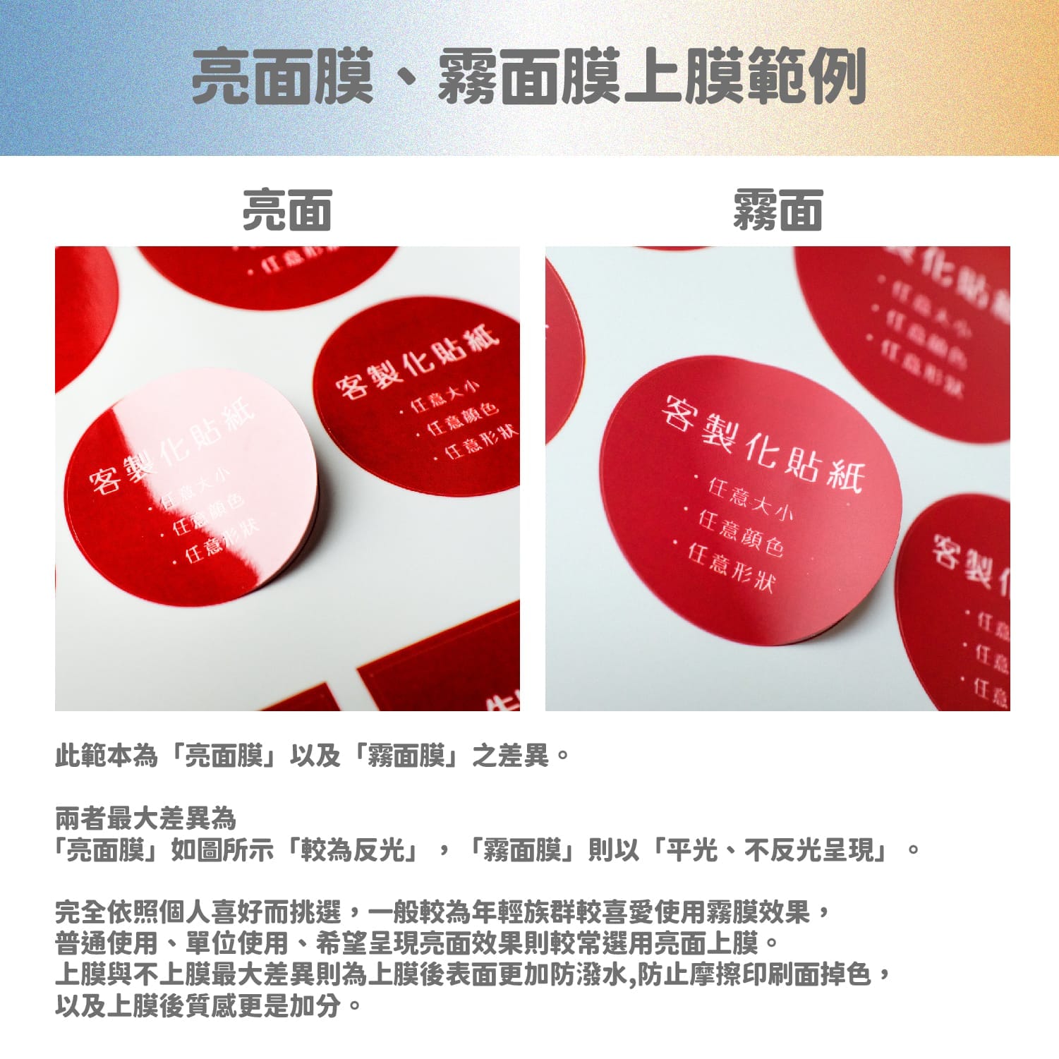 - 貼紙表層會上一層亮面膜或是霧面膜